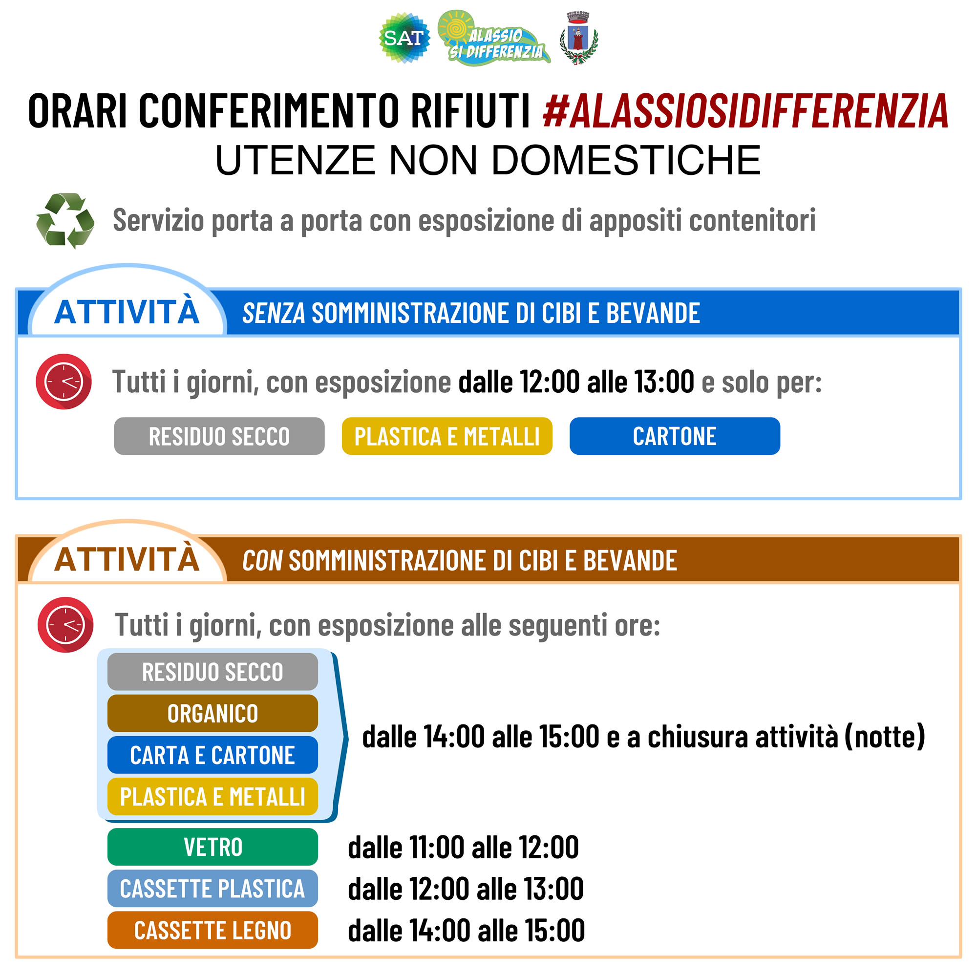 Abbiamo lasciato tutto il tempo necessario – ribadisce il Sindaco di Alassio, Marco Melgrati - anche più del necessario perchè si prendesse familiarità con i nuovi cassonetti e si iniziasse a differenziare i rifiuti. Ora però è giunto il momento di chiudere i cassonetti. E’ giunto il momento che tutti ritirino chiavi e dotazioni, è giunto il momento che si inizi a differenziare a regime”.