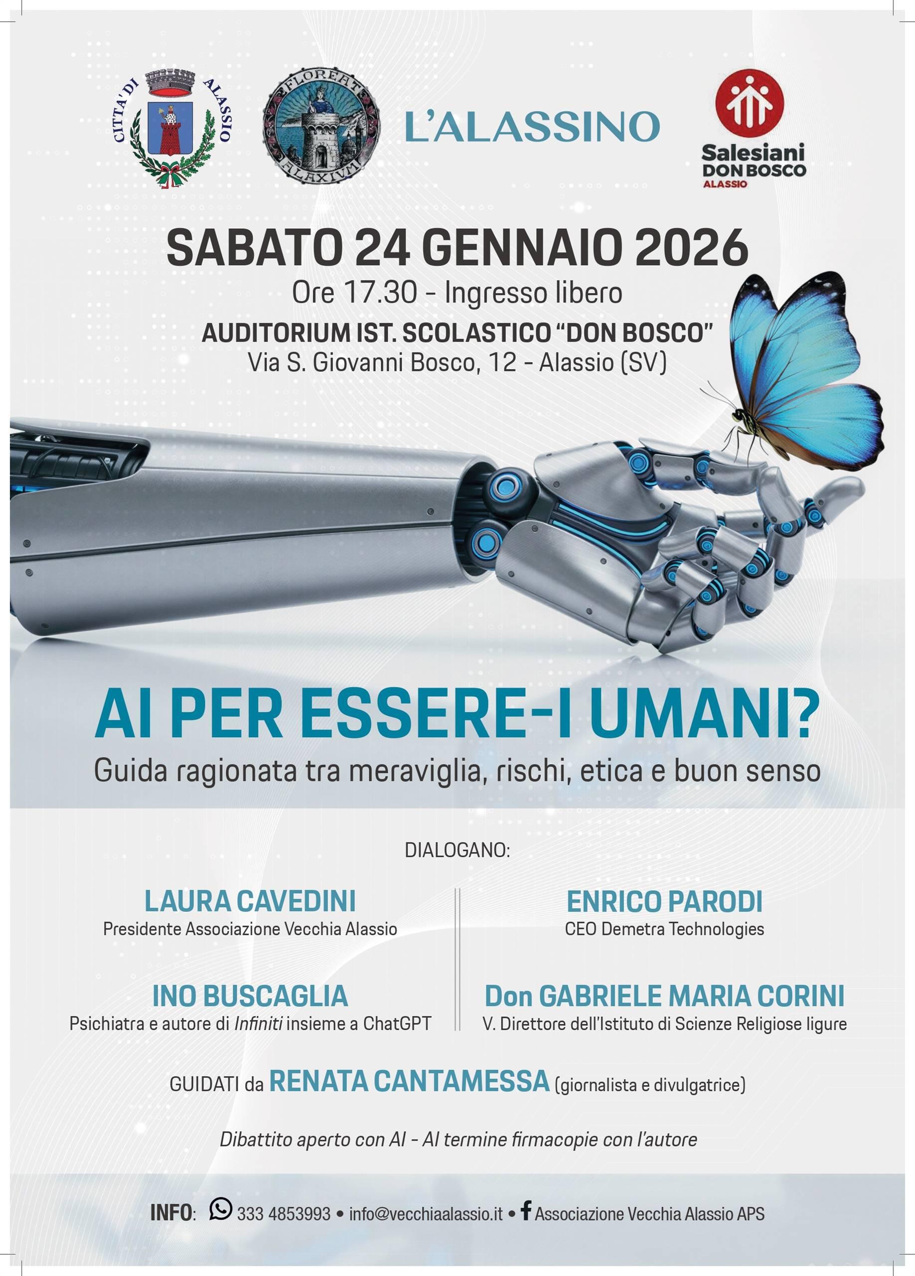 Dialogano: Laura Cavedini (Presidente Associazione Vecchia Alassio); Enrico Parodi (CEO Demetra Technologies); Ino Buscaglia (Psichiatra e autore di Infiniti insieme a ChatGBT); Don Gabriele Maria Corini (V. Direttore dell'Istituto di Scienze Religiose ligure)
