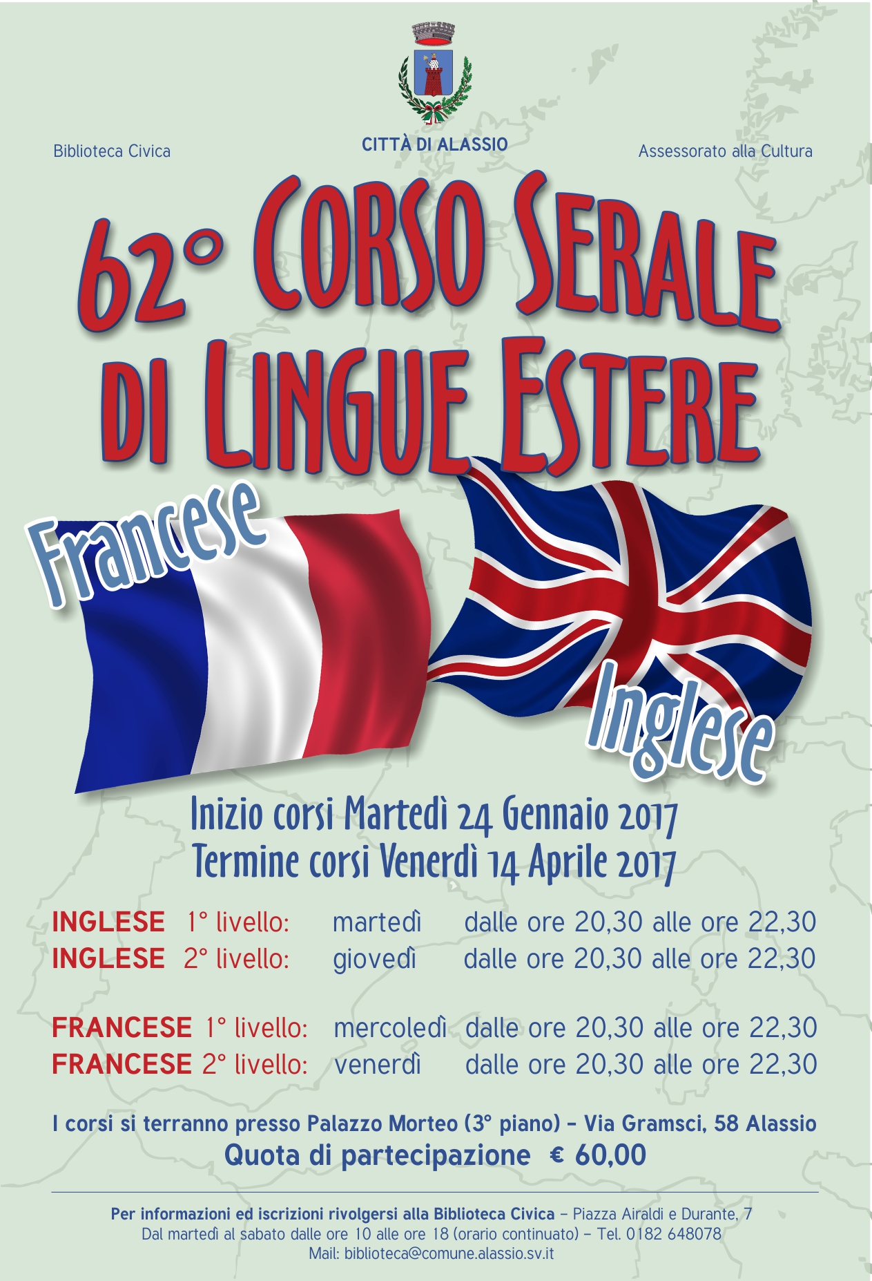 Sono aperte presso la Biblioteca Civica (dal mart. al sab. 10-18) le iscrizioni ai corsi serali di inglese e francese che si terranno a Palazzo Morteo con inizio martedì 24 gennaio.