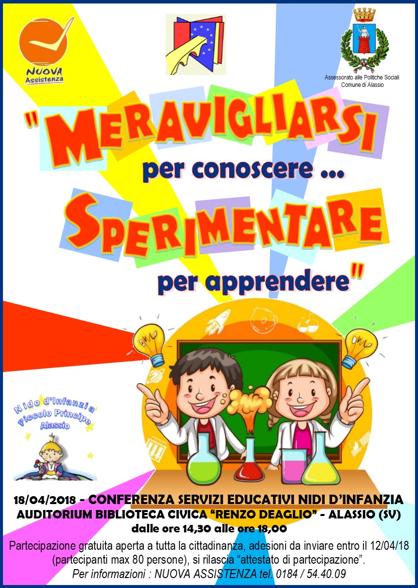 Si informa che in data 18 aprile 2018, si terrà la Conferenza "Meravigliarsi per conoscere ... sperimentare per apprendere" organizzata dalla Cooperativa Nuova Assistenza di Novara che gestisce il nido comunale "Piccolo principe", in collaborazione con il Liceo G. Bruno di Albenga e con il patrocinio del Comune di Alassio.