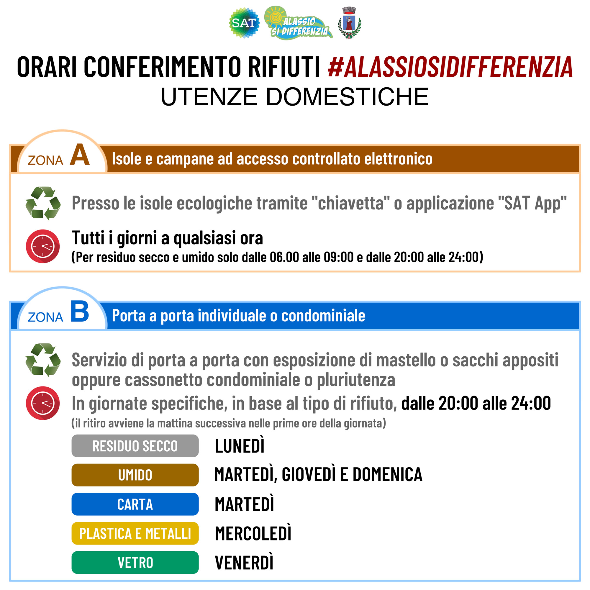 Abbiamo lasciato tutto il tempo necessario – ribadisce il Sindaco di Alassio, Marco Melgrati - anche più del necessario perchè si prendesse familiarità con i nuovi cassonetti e si iniziasse a differenziare i rifiuti. Ora però è giunto il momento di chiudere i cassonetti. E’ giunto il momento che tutti ritirino chiavi e dotazioni, è giunto il momento che si inizi a differenziare a regime”.